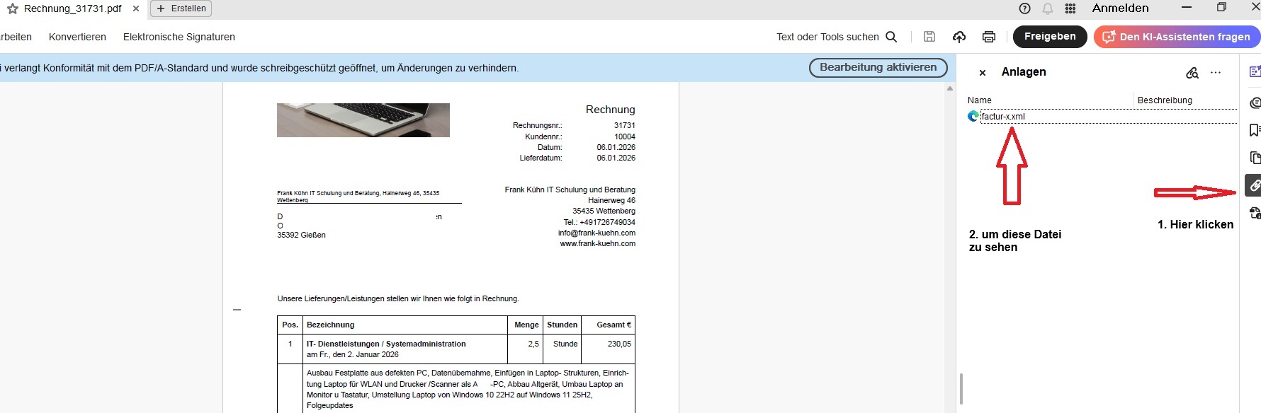 Erhält man eine E-Rechnung, bekommt man wie gewohnt kommt eine pdf- Datei. Innerhalb dieser gibt es aber einen ziemlich versteckten Anhang mit dem Namen „factur-x.xml“, der unbemerkt mitgesendet wird. Diese Datei ist nur computerlesbar und enthält etwa Kundenadresse, Rechnungsnummer, Artikel etc.